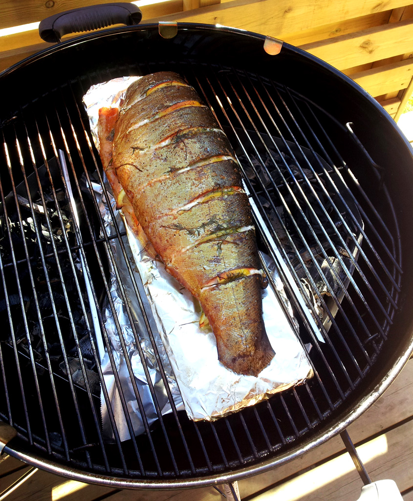 Whole smokegrilled trout on the grill Published June 2, 2012 at 845 × 1024 in Whole, smokegrilled trout Whole smokegrilled trout on the grill. Note homemade cardboard plank to ease moving.