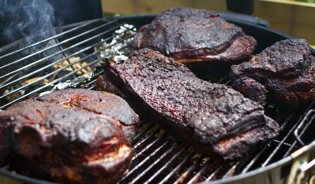 - Put the grate on, pork butts on the grate away from the fire, and put the lid on