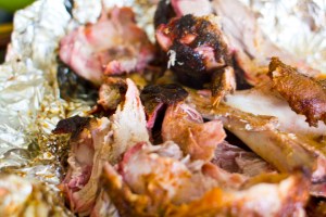 should be easily pullable by hand. Here’s a neat tip, get some thin carpenter’s gloves from your local hardware store, and buy some vinyl gloves one size up at the supermarket. Put the builder’s gloves on first and then the vinyl gloves (duh!), and you will be able to pull two pork butts without burning off your fingers (I’ve tried, not fun). If it’s not easy to pull by hand, you took it off the grill prematurely. Don’t worry, use a knife to assist you, it should still taste great. If it does not taste great, you have failed, and consequently brought shame upon your house and family.