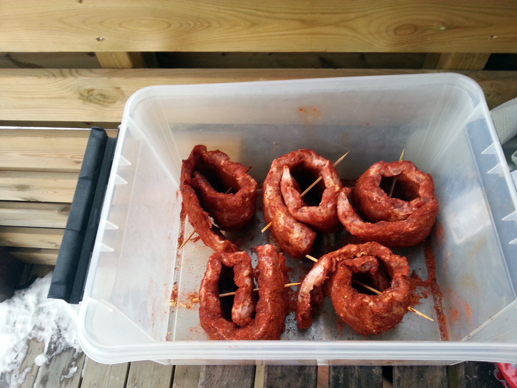 Another quick tip for you. It’s hard to fit more than 4 baby back rib racks on a standard sized Weber kettle if they’re laying flat. Sure – a rib rack helps, but not a lot. This idea is cheaper, and it works well. Roll up the racks, use a wooden skewer to hold them in place, make sure there’s room for air (smoke..) between the meat, so don’t roll them too tight. The only downside I can see to this is that it makes glazing harder, but I managed to roll mine back out again for the glazing part.