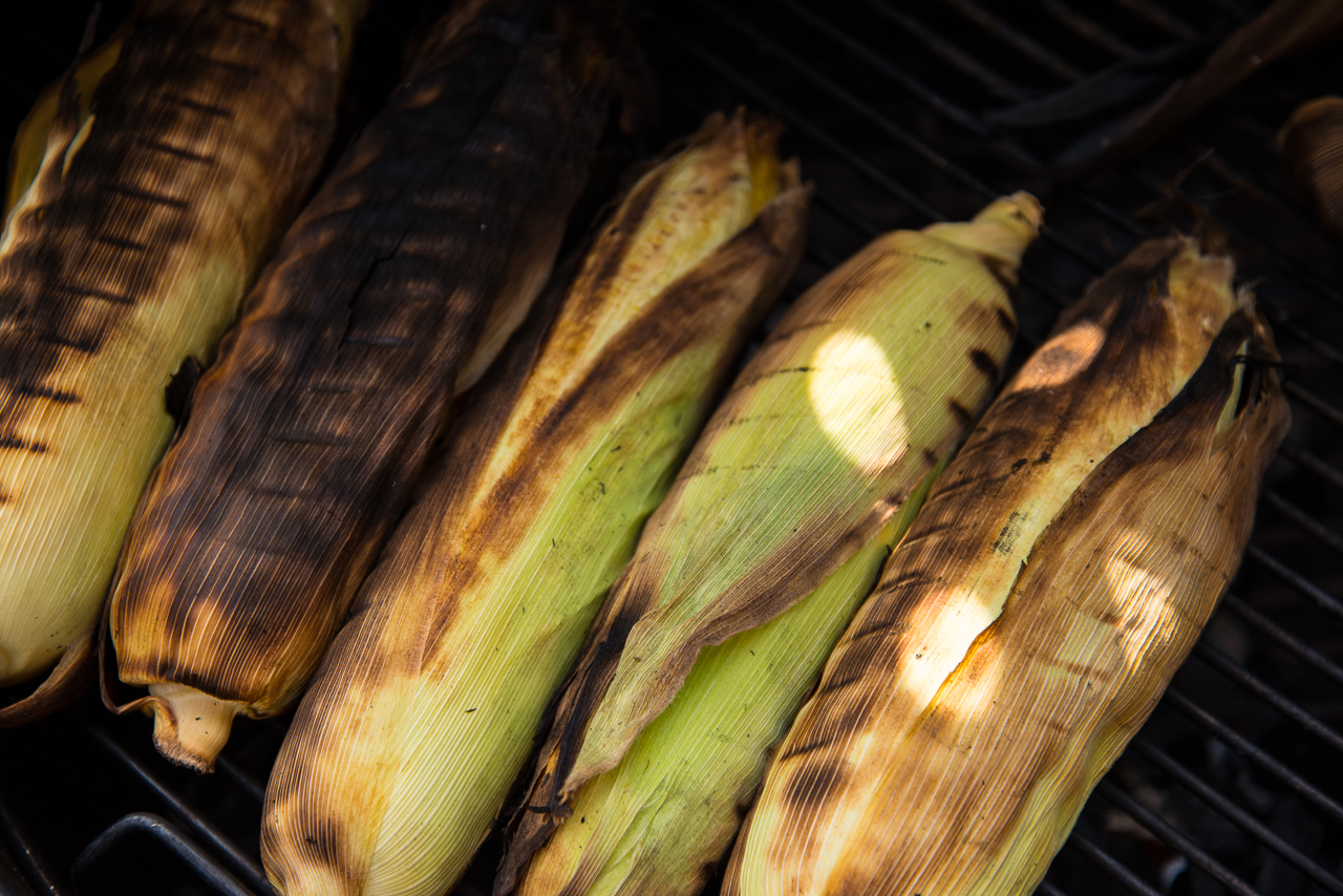 grillen, og fjerner alle bladene. Du må kanskje la maisen kjøle seg litt før du gjør dette, alt etter hvor mye kokkehender du har. Når bladene er fjernet, pensler du maiskolbene med litt vegetabilsk olje, før du bruner dem direkte over kullet. Dette går veldig fort, så her må du bare snu, snu og snu, hele tiden, hvis ikke ender du opp med brent mais.