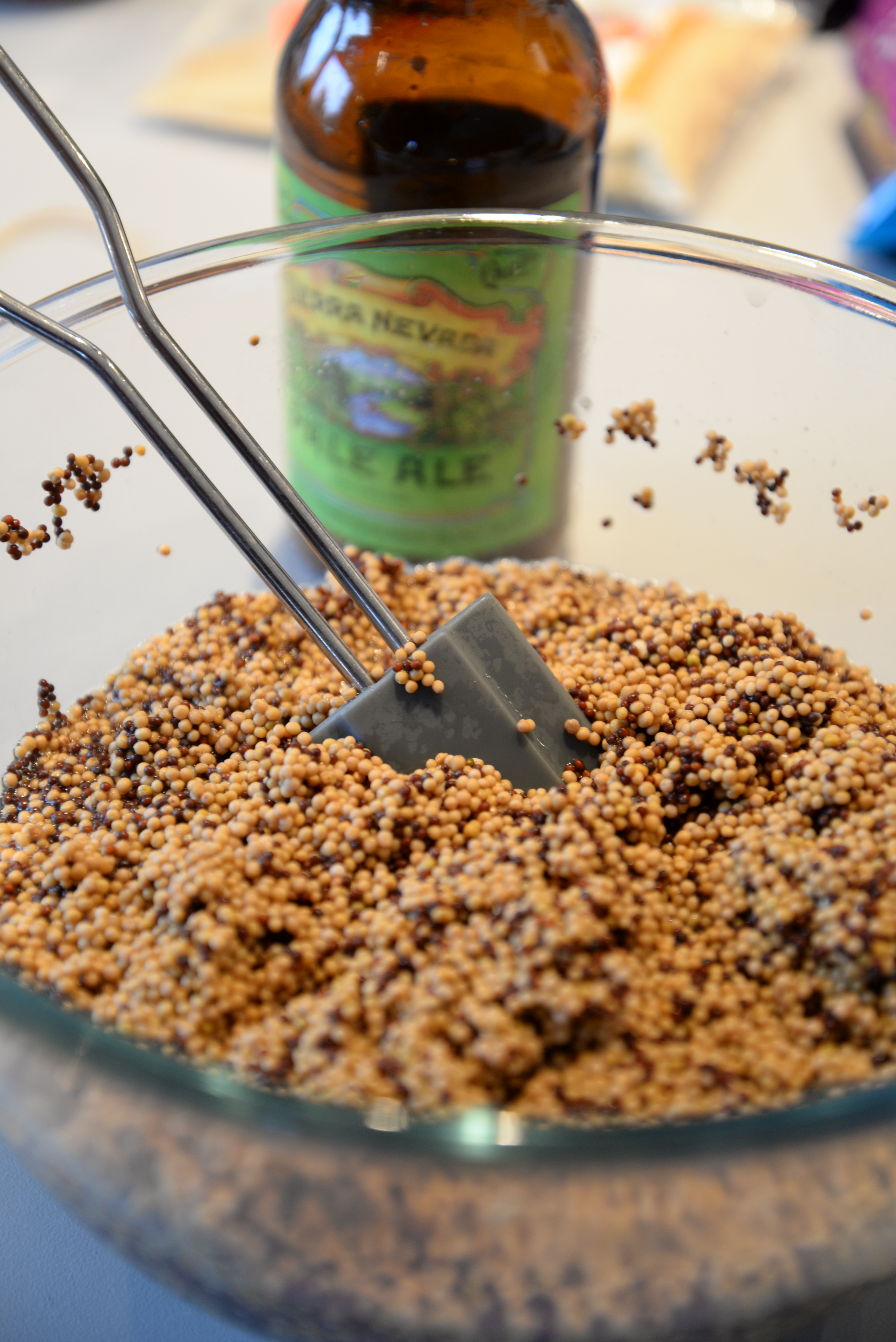 - Kvelden før sennepen skal lages, hiver du alle sennepsfrøene og hele flasken med øl i en skål, og blander godt. Den kan godt stå i romtemperatur over natten, men dekk den godt til. Dette lar de tørkede sennepsfrøene suge til seg ølet.
